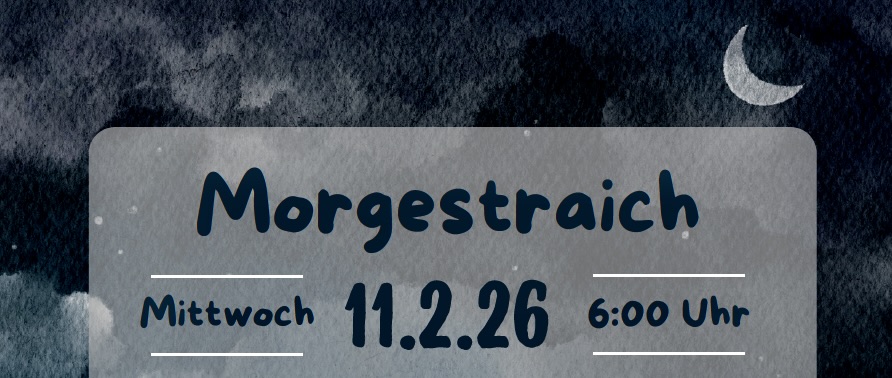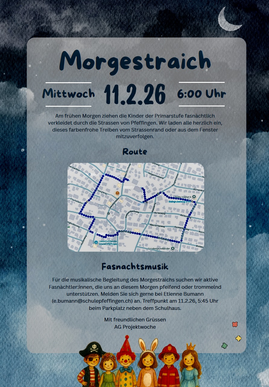 Für die musikalische Begleitung des Morgestraichs suchen wir Personen, die uns an diesem Morgen pfeifend oder trommelnd unterstützen. Melden Sie sich gerne bei Etienne Bumann (e.bumann@schulepfeffingen.ch) an. Treffpunkt am 11.2.26, 5:45 Uhr beim Parkplatz neben dem Schulhaus.